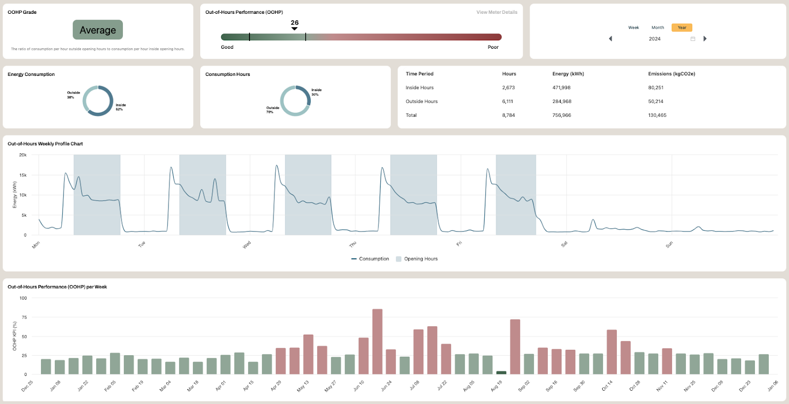 Out-of-hours analysis reveals hidden energy waste during unoccupied times. It compares actual and expected use to flag unnecessary activity and cut costs and emissions without affecting comfort.